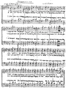 The March of Ukrainian Nationalists is a Ukrainian patriotic song that was originally the official anthem of the Organisation of Ukrainian Nationalists and the Ukrainian Insurgent Army.[1] The song is also known by its first line "We were born in a great hour" (Ukrainian: Зродились ми з великої години). The song, written by Oles Babiy to music by Omelian Nyzhankivskyi in 1929, was officially adopted by the leadership of the Organisation of Ukrainian Nationalists in 1932.[2] The song is often referred to as a patriotic song from the times of the uprising,[3] and a Ukrainian folk song.[4] It is still commonly performed today, especially at events honoring the Ukrainian Insurgent Army[5] and by nationalist organisations and party meetings, such as those of VO Svoboda.[6]