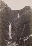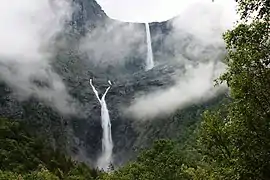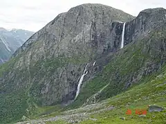 The total fall is 705 metres (2,313 ft) according to SSB,[2] 645 metres (2,116 ft) according to World Waterfall Database (WWD).[3] WWD reports that the SSB typically includes the head measurement for waterfalls that are situated within a hydroelectric system, resulting in a greater height estimate.[3] Mardalsfossen is a tiered waterfall consisting of two large drops and several smaller ones lower down. It is on average 12 metres (39 ft) wide, but it can reach up to 30 metres (98 ft) wide.[3] The highest vertical drop is one of the tallest in Norway. As with figures for the total height, discrepancies have been reported in the estimated height of each vertical drop. According to the SSB, the upper vertical drop is 358 metres (1,175 ft), while the WWD surveyed it as 320 metres (1,050 ft).[3]