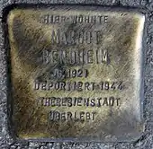 A "Stolperstein" plaque was placed on the ground in front of the building where she used to live in Kreuzberg, which is inscribed in German, "Margot Bendheim, born in 1921, lived here, deported to Theresienstadt in 1944, survived".[2]