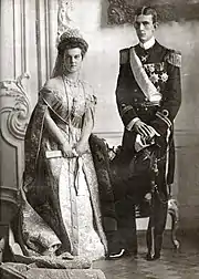 After a honeymoon in Germany, Italy and France, the newlyweds went to Sweden, where an official ceremonial reception awaited them with the state flags of Russia and Sweden waving in Stockholm.[3] In the beginning, the marriage looked successful. The couple set up their home in the Swedish countryside in the province of Södermanland.[19] They spent the summer there, returning in October to Stockholm.[19] Maria added Swedish to the other five languages she spoke, and she became popular in her new country. The Swedes felt she worked harder than her husband did. She was well liked by her father-in-law Gustaf V, who appreciated her "effervescence, charm, and unconventionality."[20] Maria Pavlovna, known in Sweden as the Duchess of Södermanland, was pregnant by the fall, but she quickly realized that she had little in common with her husband. Their relationship was cold. She had little interest in him and he in her. The couple's only child was born on 8 May 1909.[21] He was Prince Lennart, Duke of Småland, later Count of Wisborg (1909–2004)
