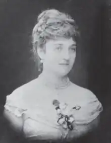 All agreed that the young Marie Boozer was an exceptional beauty with thick strawberry-blonde hair and deep blue eyes.[14] The popular Southern historian Manly Wade Wellman later wrote that she was the basis for the character of Scarlett O'Hara.[15] The diarist Mary Chesnut gossiped about Boozer's inaccurate illegitimacy but conceded that "She is a beauty—that none can deny."[16][17][18] When younger, she was hoydenish or tomboyish as well as adept with firearms. Boozer was a day student at Columbia Female College in 1860, where all grades had access to French language instruction.[19] Boozer still had considerable wealth inherited from David Boozer and during the Civil War she attended the Academy of Sacred Heart for one term in New York, where her mother had relatives. This elite school put heavy emphasis on French conversational skills. Boozer studied in Paris during 1863-1864 and, because she loved the French culture, changed her name to Marie. She then returned to Columbia.[20]