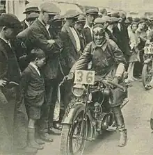 The Triumph was then used in a hill climb held by the Liverpool MCC. As the only female entrant and one of only 2 people out of 300 entrants to succeed in reaching the top of the hill she gained a lot of publicity.[5] She rode in her first motorcycle trial in 1920, the Blake Amateur Trial. After winning a gold medal in the North Wales Open Trial a motorcycle manufacturer in Wrexham, Powell, gave her a works supported machine.[6] She later had works support from Raleigh, BSA[7] and Triumph.[8] Works support ranged from a specially prepared new machine along with some financial support to a small discount on spares. British motorcycles were exported worldwide, and many were marketed on competition success. Therefore. the riders as well as the makes became famous.