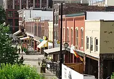 Land for the market place was given to the city by William G. Swan and Joseph A. Mabry.[3] Farmers from the surrounding area would bring their wagons to the Market House, where they sold their produce and wares.[4] During the Civil War, the Union Army used the Market House as a barracks and magazine.[5]:23–25 Knoxville's post-Civil War population boom brought about continued development in Market Square, most notably the construction of Peter Kern's confections store (now The Oliver Hotel) in 1876 and Max Arnstein's seven-story department store in 1906. After the Market House damaged by fire in 1960, the remainder of the building was demolished, and Market Square was converted into a pedestrian mall.[1]