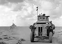 The Mark VI was a return to the 8-wheeled design. Powered by two Mercury V8 engines with an eight-wheel drive steered on the front and rear wheels. Two prototypes were built, one with a 2 pounder and other with a 6 pounder gun in an open-topped three-man turret with electric powered traverse and protected by 10 to 30 mm of sloped armour. Additional armament consisted of 2 or 3 machine guns. The two-pounder equipped version was sent to the UK for assessment, the transmission proved unreliable suffering several axle failures.[9] The 2-pdr is now in the Bovington Tank Museum, the other in South Africa.