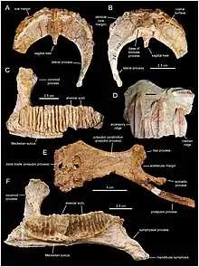Bones of an indeterminate Lambeosaurinae from the site of Cassagnau 2 in the middle part of the Marnes d'Auzas Formation. Predentary in dorsal (A) and ventral (B) views. Partial left dentary in medial view (C). Dentary tooth crowns in lingual view (D). Complete left pubis in lateral view (E). Left dentary in medial view (F), belonging to the same individual as the predentary.[3]