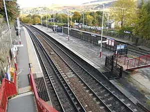 The station did have two additional platforms up until the mid-1960s (the current platform 2 having an outer face, with the fourth side platform standing where platform 3 is now) when the line was quadruple all the way from Huddersfield to Diggle Junction, but these were decommissioned when the main line was reduced to two tracks in 1966. The station avoided closure in the wake of the 1968 cutbacks that claimed many others on this section of route, but for some years acted as the terminus for local stopping trains from the Leeds direction[2] (hence the provision of signalling that allows trains to start back east from platforms 2 & 3) and had no regular service towards Stalybridge and Manchester.