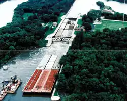 The Marseilles Lock and Dam, also known as Lock and Dam 5, is a lock and dam complex on the Illinois River at Marseilles, Illinois. The complex includes a lock, dam, control station, boiler house, and a 2.5 miles (4.0 km) section of navigation canal. The state of Illinois began work on the complex in 1920 by digging the canal, which was completed in 1925. The state also began construction on the lock, dam, and control station; however, due to financial difficulties these projects were finished by the U.S. Army Corps of Engineers. Walter Mickle Smith was chief design engineer for the complex. The complex was completed in 1933.[2][3] The lock has a drop of 24 feet (7.3 meters).