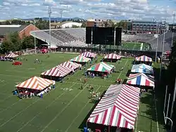 The Mooberry Track was constructed north of the stadium, then the site of the old Bailey baseball field, with home plate at the northwest corner. Baseball was relocated northeast, toward the golf course, to Bailey–Brayton Field. The original plan was for the track to occupy that space, but soil issues caused a revision.[43][44] The new track debuted in the spring of 1980 and hosted its first event on May 3, a decisive dual-meet win over rival Washington.[45][46]