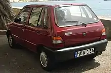 Exports to neighboring countries commenced in 1987, and were followed by a shipment of 500 cars to Hungary, with the first car arriving on 24 October 1987.[4] Soon, exports to Czechoslovakia and Yugoslavia followed, two other markets with less restrictive homologation requirements than Western Europe. After successes there, and in spite of Suzuki's objections, Maruti Suzuki tackled more competitive markets and entered France in 1989, the Netherlands in 1990, followed by England, Malta, and Italy.[5] In markets where Japanese cars had a quota, the 800 was sold as a Maruti, with all mention of Suzuki carefully removed – even the manuals were revised, so as not to fall afoul of the quota requirements.[5] The 800 continued to be sold in Italy and other Western European markets until 2004, when it could no longer be made to meet emissions and safety equipment.[6] The Maruti Suzuki had never been equipped with seat belts until exports began, meaning that such parts originally had to be imported from Japan to be fitted to export market cars, as with everything relating to building left-hand-drive cars.[4] The Maruti also got its first catalytic converter to meet European requirements. The cleaner 35 PS (26 kW) version first arrived in August 1992 and was originally reserved for Europe.[7]