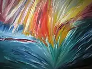 There are a lot of opposing elements such as movement, space, proportion, and color in Small Figure. Having the child not centered in the space adds to the illusion of the figure along with the coat covered most of the figure's body. The messiness of the strokes brings movement to the work. One can almost imagine the artist hurriedly using her paint-stained fingers to complete the form. There are lines that look like they had been gone over multiple times outlining the sweater and its pattern. The messiest strokes are around the head, face, and hands. The hands look like explosions coming from the sleeves. This movement brings a lot of energy to a figure whose pose does not allude to very much motion at all. In other works such as, Volcanic Eruption, Barnes is known for using a plethora of colors. In Small Figure, however, those colors are absent. Instead, black is the only color added to the white surface of the paper. The movement in the work comes through solely with short quick lines from the artist's fingers. Fingers that move so fast they may look just like the hands in the painting, exploding outwards from the wrists. This movement is confined mostly to the figure and a small space surrounding it giving the viewer a sense of angry tension bubbling right under the surface. Beyond the figure in the background is the clear white sheet untainted by the black energy of the figure. These conflicting elements show the inner struggle with anger and powerlessness the artist may have felt around the time of her painting this work and working on her regressive therapy.