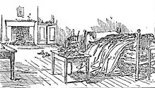 Number 13 Miller's Court was a single twelve-foot square room, with a bed, three tables and a chair. Above the fireplace hung a print of "The Fisherman's Widow",[42] and a small tin bath was beneath the bed.[43] Two irregularly sized windows faced the yard, in which the dustbin and water tap serving the property were located, and the door opened directly into the twenty-six-foot-long arched passageway which connected Miller's Court with Dorset Street. This door was illuminated at night by a gas lamp located almost directly opposite the door to the property.[44]