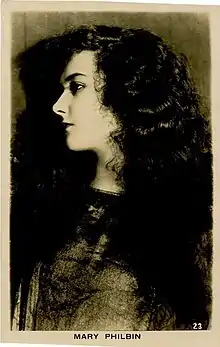 During the 1920s, Philbin starred in a number of high-profile films, most notably in D. W. Griffith's 1928 film Drums of Love. In 1927, she appeared in Edward Sloman's Surrender with Ivan Mosjoukine,[7] though her most celebrated role was in the Universal horror film The Phantom of the Opera in 1925.[8] Philbin's ethereal screen presence was noted in a 1924 edition of Motion Picture Classic, in which she was referred to as "one of the astonishing anomalies of motion pictures. Pat O'Malley once said of her: 'If I were superstitious I would think that the spirit of some great tragedienne of a forgotten past slipped into Mary's soul when she heard the camera begin to click.'"[9]