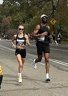 Shalane Flanagan and Matt James at mile 24 of the 2023 New York City Marathon