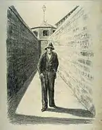 Luce aligned with the Neo-impressionists not only in their artistic techniques, but also in their political philosophy of anarchism. Many of his illustrations were featured in socialist periodicals, notably La Révolte, Jean Grave's magazine which was later called Les Temps nouveaux.[1] Other socialist/anarchist publications which he contributed to include Le Père Peinard,[4] Le Chambard,[11] and La Guerre sociale.[8] On 8 July 1894, Luce, suspected of involvement in the 24 June assassination of President of France Marie François Sadi Carnot, was arrested and was confined to Mazas Prison. He was released forty two days later, on 17 August, following his acquittal at the Procès des trente. He published Mazas, an album consisting of ten lithographs documenting the experiences of himself and other political prisoners incarcerated in Mazas; accompanying the lithographs was text by Jules Vallès.[11] In 1896, while King Alfonso XIII of Spain was visiting Paris, the police detained Luce on the grounds that he was a "dangerous anarchist".[12]