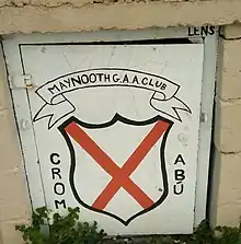The motto Crom Abú originated from the war cry of the Fitzgerald family. Croom is a castle in Co. Limerick which formerly belonged to the FitzGeralds. "Abfi" means 'to victory', 'for ever' or literally 'defying' . This is one of the many Irish gathering cries, the use of which was forbidden by repeated Acts of Parliament. The Geraldines of Maynooth retained the motto but were forced by an Act of Parliament to change the motto to "Si Dieu plet Crom Abu". Maynooth GAA have retained the original version which means:- Maynooth to Victory.