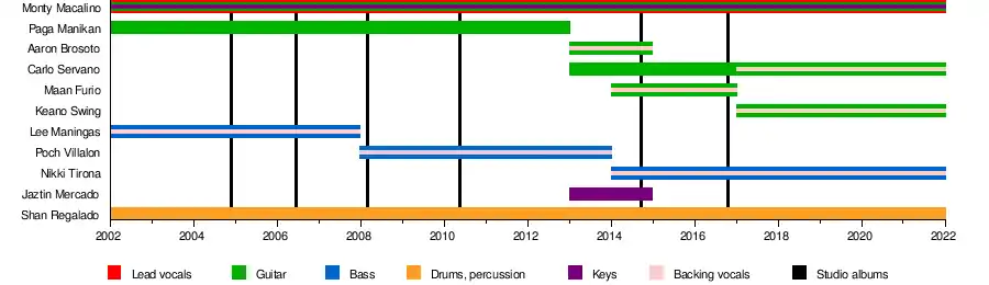 In 2014, keyboardist Jaztin Mercado left the band to move to Singapore. In the same year, the band recruited Maan Furio to play guitars, as well as do backing vocals. In late 2014, bassist and backing vocalist Poch Villalon also left the band to pursue other interests. Villalon has since been a session player for Rico Blanco and regular synth player and backing vocalist of Silent Sanctuary after departing and was replaced by Nikki Tirona to fill in his position as bassist and backing vocalist for the band. In mid-2015, lead guitarist Aaron Brosoto left the band to pursue other interests as well.