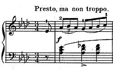 The third mazurka, in F minor, has a folkish and rustic atmosphere. After a few bars of introduction, the main theme appears, characterized by a colorful Slavic melody and sharp rhythms and accents. The second theme, A-flat major, is quite lively and includes a section with a bass motif. The main theme is reprised, this time in a slightly modified form, and the piece ends quietly, marked pianissimo. A performance of the mazurka lasts for a little under three minutes.[3]