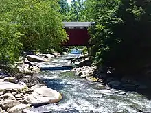 View of the covered bridge in McConnells Mill State Park from a walkway near the mill itself.