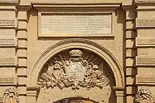 The Mdina Gate consists of a Baroque portal and a superstructure serving as a gatehouse. The portal is decorated with double pilasters, the coats of arms of Grand Master António Manoel de Vilhena and the city of Mdina, a trophy of arms and a Latin inscription reading:[9]