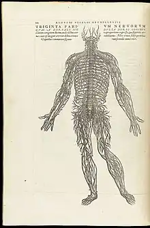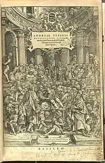 He wrote around 14 books on his findings in anatomy, including his best known book De humani corporis fabrica.[11] It was revolutionary because of the accuracy and precision of his descriptions and images of organs and would refute Galen's belief that human anatomy is closely related to apes.[14] The book was a dedication to Charles V, Holy Roman Emperor. Vesalius published De humani corporis fabrica at the age of 28.[14] With him being so young, it made his contributions harder to accept. De Fabrica was a milestone in medical science as it detailed many aspects of the human cadaver as well as presenting it in the form of art. Its imagery drew on new Renaissance methods in art. An example of his work is a picture of a dissected corpse hung by a rope through its eye sockets with the upper diaphragm on a wall behind the corpse.[14] The book gave clear identification of the organs in the human body while also removing the aspects that he found flawed with Galen's teachings.