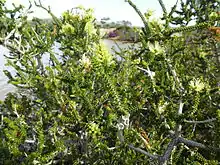 Melaleuca blaeriifolia is an erect to spreading shrub in the myrtle family, Myrtaceae and is endemic to a small area in the south-west of Western Australia. It has small leaves and small greenish-yellow flowerheads.