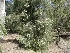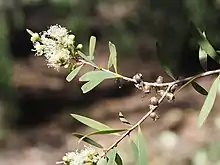 The white flowers are grouped in spikes up to 30 mm (1 in) long at the ends of branches which continue to grow after flowering, and sometimes in the upper leaf axils. Each spike contains 3 to 16 flowers loosely arranged and up to 35 mm (1 in) in diameter. The petals are 3.5–3.8 mm (0.14–0.15 in) and fall off as the flower matures. The stamens are arranged in five bundles around the flower and there are 11 to 26 stamens in each bundle. Flowering occurs in early spring but the flowers are relatively short-lived. The fruit are woody, cup or barrel-shaped capsules 4–5 mm (0.16–0.20 in) long, 4–7 mm (0.2–0.3 in) in diameter and spaced along the branches.[2][3][4][5]