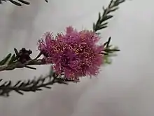 This species flowers profusely with deep pink flowers in clusters along the stems. The clusters contain between 4 and 15 individual flowers and are up to 12 mm (0.5 in) in diameter. The petals are 1.2–2.3 mm (0.05–0.09 in) long and fall off soon after the flower opens. The stamens are arranged in five bundles around the flower, each bundle containing 4 to 12 stamens. Flowering occurs in early spring and is followed by the fruit which are woody capsules 2.6–3 mm (0.10–0.12 in) long in loose clusters along the stem.[2][3]