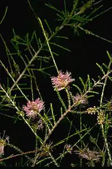 The flowers are arranged in spikes at the ends of branches which continue to grow after flowering or sometimes in the upper leaf axils. The spikes contain 3 to 12 groups of flowers in threes and are up to 18 mm (0.7 in) in diameter and 15–20 mm (0.6–0.8 in) long. The flowers are pink or mauve when they open but fade rapidly to white. The petals are a darker shade, 1.5–1.6 mm (0.06–0.06 in) long but fall off as the flower ages. The stamens are arranged in five bundles around the flowers and there are 5 to 9 stamens per bundle. Spring is the main flowering season and the flowers are followed by fruit which are woody capsules 2.5–4 mm (0.1–0.2 in) long and scattered along the branches.[1][3]
