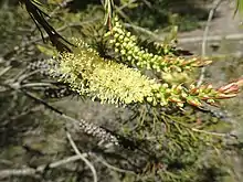 The flowers are white or pinkish, arranged in spikes on the ends of branches which continue to grow after flowering. The spikes contain 5 to 20 groups of flowers in threes, or sometimes individual flowers, and are up to 20 mm (0.8 in) in diameter and 20 mm (0.8 in) long. The flower buds are woolly. The stamens are arranged in five bundles around the flowers and each bundle contains 11 to 25 stamens. Flowering occurs in the spring and is followed by fruit which are woody, cup-shaped capsules 3–4.5 mm (0.1–0.2 in) long in loose clusters.[2][3][4]