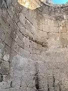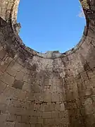 The wall’s inner surface rises vertically up to a height of 1.5 meters and then passes into a curved convex surface. The interior area, covered with gray plaster, repeats the outline of the outer part of the walls. In the southern part of the inner wall there is a small shallow niche of the mihrab facing the front door. The light enters the mausoleum through four small skylights at the base of the dome.[4]