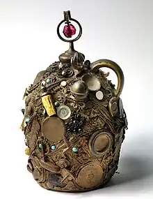 A memory jug may be any kind of vessel but is most usually a jug or vase. Items used to cover the surface range from shards of china, glass, and mirror to shells, beads, buttons, coins, medals, keys, jewelry, toys, watches, and other small objects.[1][2] These are adhered to the surface using some kind of adhesive, typically putty or cement.[1][2][3] The final piece may also be overpainted to create a more uniform surface.[3] Memory jugs are closely related to the broken-china mosaic form known as trencadÃs that began to appear in the early 20th century.