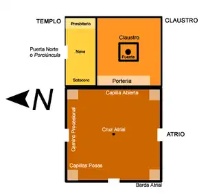 - ↑ Schroeder Cordero, Arturo. "Las funciones del atrio conventual mexicano", in Conferencias del bicentenario de la fundación de la Escuela de Pintura, Escultura y Arquitectura. Mexico, UNAM-Faculty of Architecture, 1984.