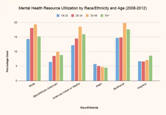 Stigmatizing mental health discourages the use of resources, even when they are available. Within the Asian American community, there is a great stigma against reaching out for help with mental health. Despite higher levels of unmet mental health needs than their White counterparts, Asian Americans hesitate to reach out for help with mental health due to “a deeply felt stigma against mental illness”.[11] This is a deep rooted issue amongst the Asian American community due to culture that encourages suppressing emotions. "Asian Americans have the lowest rates of service utilization and help-seeking behaviors (Stanley, 538)."[4] Additional research studies have found that both in-patient and out-patient hospital resources have extremely low rates of utilization by Asian Americans compared with all other ethnicities.[2] This low utilization is the case despite Asian Americans having higher than or comparable rates of mental illness to white Americans.[12] "Asian Americans have a 17.30 percent overall lifetime rate of any psychiatric disorder and a 9.19 percent 12-month rate, yet Asian Americans are three times less likely to seek mental health services than Whites.” [13] Stigma and shame deter Asian Americans from utilizing mental health resources available to them. In order to adequately care for Asian Americans in the mental health field, cultural considerations must be taken into account my providers.[4] When Asian Americans do seek out help, their tendency to focus on physical symptoms instead of emotions sometimes results in misdiagnosis.[2]