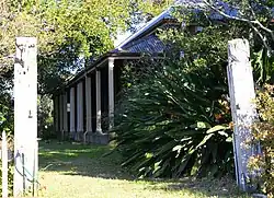 The house is surrounded by a mature rural homestead garden, dominated by several large Moreton Bay fig trees (Ficus macrophylla). A large shelter belt on the western boundary is lined with coral trees (likely Erythrina x sykesii). Other trees marking the garden include Peruvian pepper (corn) tree (Schinus molle), rough-barked apple (Angophora floribunda). Major shrub plantings include oleander (Nerium oleander), cotoneaster (C.sp.), giant bamboo (Bambusa balcooa), a hedge of Photinia robusta cv., may bush (Spiraea cantonensis) used as extensive hedging, box (Buxus sempervirens) similarly used as hedging at a lower level closer to the house's front, variegated century plants (Agave americana 'Variegata'), large old Camellia japonica cv.s and two large climbing Bougainvillea glabra cv. on the rear, western fence.[1]