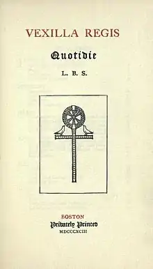 While the Altar Book was being prepared, Updike worked on other titles. The first of these was Vexilla Regis Quitidie, completed in 1893. The book was a selection of prayers and hymns for every day of the year compiled by Lucy Bradlee Stone. Because Merrymount had not yet acquired much type, the book was actually printed by Riverside Press, although Updike did arrange the book.[21]