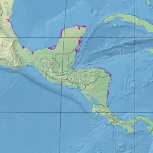 The ecoregion's northernmost site is at Tampico in the Mexican state of Tamaulipas, where the Pánuco River meets the Gulf of Mexico. It covers most of the coastal areas south through Mexico, Belize, Guatemala, Honduras, Nicaragua, Costa Rica, and Panama, with the southernmost site at the Gulf of Guna Yala in Panama.[1] This stretches 2,500 km, from 22.2 degrees latitude in the north to 9.5 degrees latitude in the south.