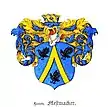The shield is crowned with a baronial crown. The basting on the shield is blue, enclosed in gold.[5]