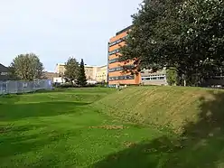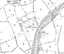 It lies on the course of a Roman road, Icknield Street, which is now the site of the present Queen Elizabeth Hospital and the University of Birmingham in Edgbaston. The fort was constructed on the orders of Publius Ostorius Scapula soon after the Roman invasion of Britain, roughly in AD 48.[2] The fort was around 200 square metres (2,153 sq ft) in area and was defended by a turf and earth bank with a timber wall, towers and double ditches.[3] Within the fort were timber buildings including barrack blocks, a granary, a workshop and a store. In AD 60 or 61, Metchley Fort may have been involved in the Boudican Revolt, and in AD 70, the fort was abandoned, only to be reoccupied around AD 90, when another fort, half the size of the original, was built on the same site, before being abandoned again in AD 120. It would have then likely been in sporadic use as a training camp up until its complete abandonment by c. AD 200.