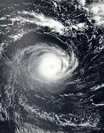 The BoM also reported that Freddy's winds weakened to 155 km/h (100 mph).[24] Despite easterly vertical wind shear, Freddy maintained a symmetric convective core.[25] The cyclone's ragged and cloud filled eye appeared on satellite imagery.[26] At 12:00 UTC on 14 February, Freddy crossed 90° E into the South-West Indian Ocean basin, and was immediately classified as a tropical cyclone by Météo-France (MFR)[nb 3][28][29] The MFR upgraded the system to an intense tropical cyclone.[30] Freddy exhibited highly symmetrical and annular characteristics around 03:00 UTC on 15 February.[31] Later the next day, the JTWC also assessed Freddy as having 1-minute maximum sustained winds of 270 km/h (165 mph), making the storm a Category 5-equivalent tropical cyclone,[32][33] as the cyclone sustained a symmetric ring around deep convection.[34] During 18 February, Freddy began to rapidly deteriorate as a sudden spike in mid-level shear began impacting the storm.[35]