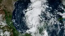Harvey shortly after emerging into the Gulf of Mexico on August 28.