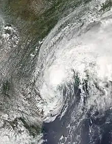 The center of Harvey crossed the coast near Cameron, Louisiana, at 08:00 UTC on August 30 with winds of 75 kilometres per hour (45 mph) and a central pressure of 991 mbar (29.26 inHg).[2] As the storm moved farther inland, weakening commenced once again and Harvey weakened to a tropical depression at 00:00 UTC on August 31.[2] Consequently, the NHC issued its last advisory on the cyclone three hours later, with further information to be handled by the Weather Prediction Center (WPC).[48] While continuing to generate heavy rainfall, Harvey began to lose its tropical characteristics, ultimately transitioning into an extratropical cyclone at 06:00 UTC on September 1 over the Tennessee Valley.[2] Eventually, what was left of Harvey weakened to the point where the WPC terminated advisories on the storm, which it did at 15:00 UTC the next day.[49] The remnants continued moving northeastwards while interacting with a developing low-pressure area over the Mid-Atlantic,[49] dissipating shortly afterwards over northern Kentucky.[2]