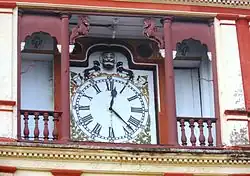 The "Methan Mani" is located near the Padmanabha Swamy Temple in Thiruvananthapuram.[1] To see it, one has to stand before the temple entrance and look in the opposite direction of the Padmatheertha pond. It is on the top of the Old Fort Palace. The unique feature of the clock is the presence of a bearded man on top of the dial who opens his mouth corresponding to every hour when two rams hit his cheek and forcing him to close his mouth. This action is coordinated with the hourly chimes.