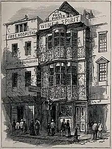 The hospital was founded by Jonathan Fry, a son of Elizabeth Fry, to provide medical treatment for the destitute, in 1836.[1][2] Its mission was ‘to grant immediate relief to the sick poor of every nation and class whatever may be their diseases, on presenting themselves to the charity without letter of recommendation; such letters being always procured with difficulty and often after dangerous delay’.[3] It was based initially at 29 Carey Street, near Lincoln's Inn, previously the home of the silversmith Richard Cooke.[4] In 1843, Prince Adolphus, Duke of Cambridge sponsored its first inpatient beds.[1]