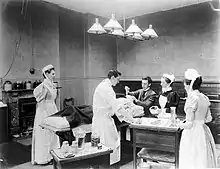 The Order of All Saints, also known as the Sisters of St Peter's of Kilburn were asked to reorganise the nursing care in 1888 and ran the nursing department until 1895. In 1897 Eva Luckes, Matron of The London Hospital agreed that one of her staff, Mabel Cave RRC (1863–1953) could go there for six months to reorganise the nursing department.[7] Cave took with her several nurses to reorganise and instill Nightingale style nursing. Cave became matron of The Westminster Hospital in 1898.[8]