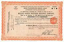 Canadian share of the Mexico North Western Railway, issued 8. March 1909