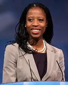 In 2012, National Journal named Love one of ten Republicans to follow on Twitter.[24] When speaking to the 2012 Republican National Convention on August 28, 2012, she discussed lessons learned from her parents, immigrants from Haiti who fled political repression.[25] She said, "Mr. President, I am here to tell you we are not buying what you are selling in 2012."[26] CNN described Love as a "rising star".[27]