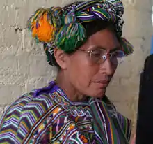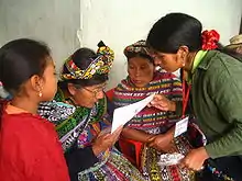 A Guatemalan woman tests a pair of reading glasses at a village campaign.