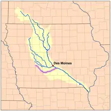 The Middle River is a tributary of the Des Moines River in south-central Iowa in the United States. It is 123 miles (198 km) long[3] and drains an area of 489.5 square miles (1,268 km2).[4] Via the Des Moines River, it is part of the watershed of the Mississippi River.