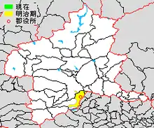 Midono District was created on December 7, 1878, with the reorganization of Gunma Prefecture into districts. It included three towns (Ochiai-Shin, Fueki-Shin and Fujioka) and 42 villages, almost all of which were formerly part of the tenryō holdings in Kōzuke Province administered directly by the Tokugawa shogunate. With the establishment of the municipalities system on April 1, 1889, the area was organized as three towns (Fujioka, Onishi and Shin) and seven villages.