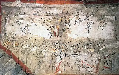 References to "great shields" occur in their usage on the front line to protect spearmen and crossbowmen. Shields were also commonly paired with the single edged dao and used among cavalrymen.[28] Descriptions of the Battle of Guandu mention that Cao Cao's soldiers employed shield cover above their heads each time they moved out into the open due to oppressive arrow fire from Yuan Shao's wooden towers.[29]
